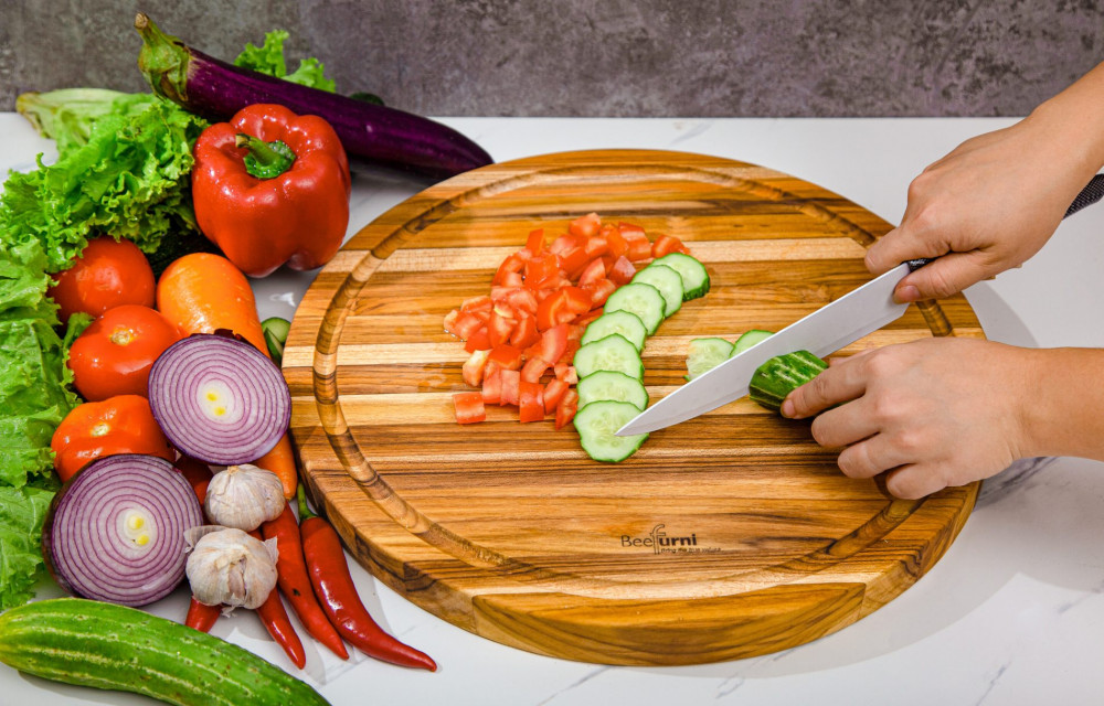 BEEFURNI offers a wide range of wooden products that can definitely answer the needs of home organization and decoration lovers. Crafted from high quality natural wood, our products include wooden racks, shoe racks, stools and kitchen supplies such as cutting boards and wooden utensils. Not only do they highly functional, the minimal yet trendy designs of our products make them a great décor for your beloved houses. This round cutting board is made of 100% teak wood that is strong and durable. It's designed to have an extra wide juice groove that allows juices, oil or loose pieces of food to sit and pool, to reduce spills while cutting and keeping your kitchen and dining areas clean. It also comes with a hand grip design for a better grab without slipping.
